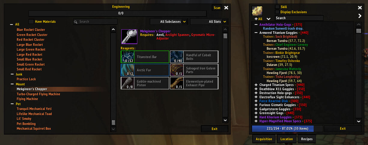 Ackis Recipe List is an addon that scans your professions and shows which recipes you’re missing, along with detailed information on how to obtain them (drops, vendors, reputation, etc.). You open your profession window and press the Scan button, and the addon builds a list of missing recipes that you can filter and track right in the game.