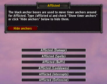After installing, type /afflicted to see basic commands and /afflicted ui to open the configuration window. From there you can enable or disable spell lists, move and grow the timer bars, and use options like /afflicted clear to reset timers or /afflicted test to simulate cooldowns.