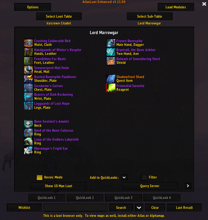 AtlasLoot (AtlasLoot Enhanced) is an in-game loot browser that lets you view loot tables for bosses, dungeons, raids, factions, PvP rewards and collections whenever you want, without being at the instance or vendor. You can browse by instance or raid, reputation faction, PvP set, crafting profession and special collections such as tier sets, mounts, pets, tabards, legendaries and world events, with full item tooltips, drop chances and price previews.