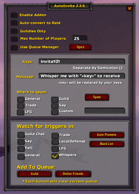 AutoInvite is a chat-based group and raid helper that automatically invites players who use a chosen keyword in whispers or specified channels. It’s perfect for forming pugs and guild runs: you set one or more trigger words and the addon handles invites, with options like auto-converting to a raid, guild-only filtering and a max player cap so you don’t overfill the group.