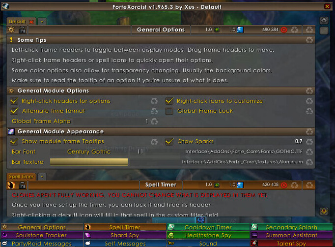 ForteXorcist is a powerful spell and cooldown timer package that tracks your buffs, debuffs, procs and important abilities in clear bars, with extra tools like warning sounds and self/raid messages, plus soulstone, summon and healthstone management for warlocks.