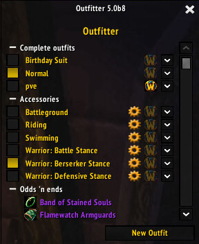 Outfitter is an equipment set manager that lets you create multiple “outfits” and swap full gear sets instantly for PvE, PvP, farming or roleplay, with optional automatic equip/unequip rules for different situations.
