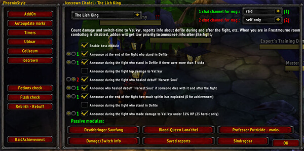 PhoenixStyle is a raid leader toolkit that tracks important “fails” and other useful boss-fight info (who stood in bad, key mechanic tracking, etc.) and can report results to chat with built-in anti-spam.