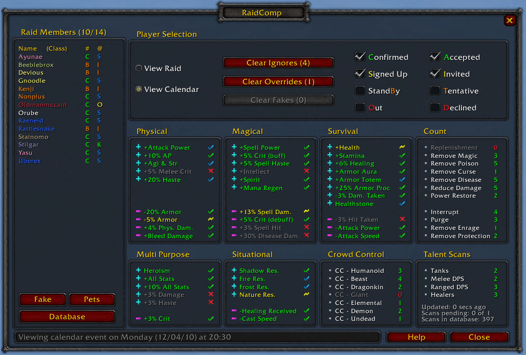 RaidComp scans your current raid and shows which key raid buff and debuff categories are covered (including pet-provided buffs), helping raid leaders quickly spot what’s missing and fine-tune the lineup.