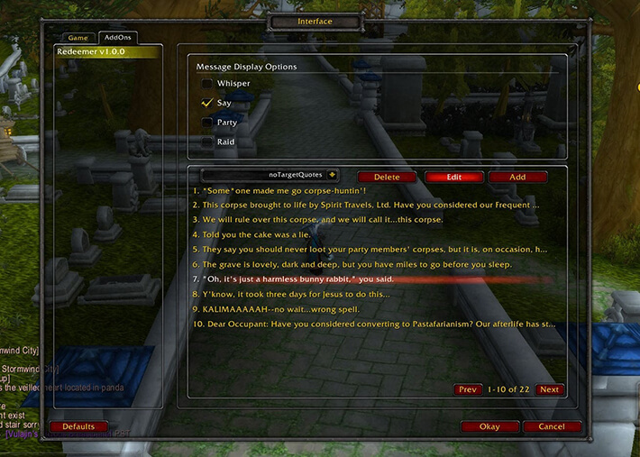 Redeemer is a fun “fluff” addon that automatically says humorous quotes whenever you cast a resurrection spell, adding personality to your rezzes. You can choose which chat channels it uses and manage the quote list (add/edit/remove or restore defaults).