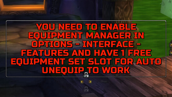 Requirement: you must enable the in-game Equipment Manager (Options → Interface → Features) and have 1 free equipment set slot available so the aura can save and use a set for auto re-equip.